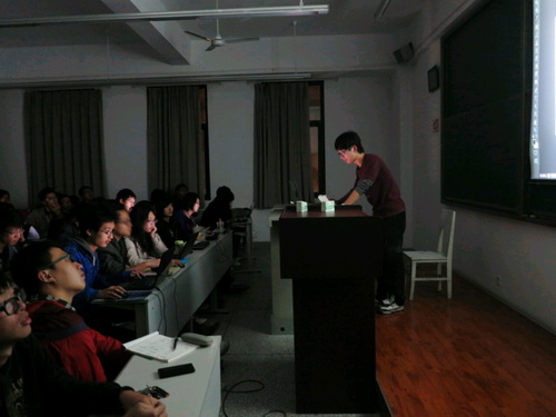 首先,做讲解的是陈熙同学,在PS软件中,陈熙同学非常详细地讲解了几类制作美轮美幻的效果的方法和流程。整个演示过程中,他重点表现了PS软件中各个功能之间的重要区别、联系和配合,并强调了每个功能的优点与缺点。观众们则通过投影仪清晰的看到了演讲者的每一步操作。经过记者调查,初学者反映通过陈熙同学的讲解对PS软件有了一个较全面的认识,老用户也感到受益匪浅。