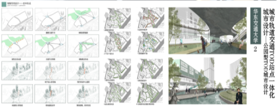 华东交通大学参加答辩的曹超、陈驰、吴宇桐、郭昊杨四位同学带来的作品是《城市轨道交通TOD站点一体化城市设计——公园型TOD城市设计》。提出了能够融入周边区域绿地结构、缝补区域城市肌理、优化景观环境、梳理城市交通、优化步行环境的城市物质空间形态构想和控制引导策略。