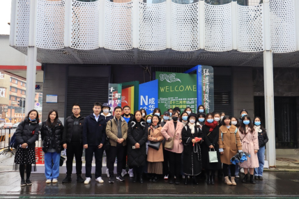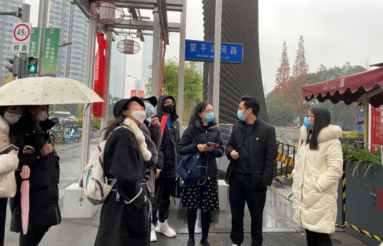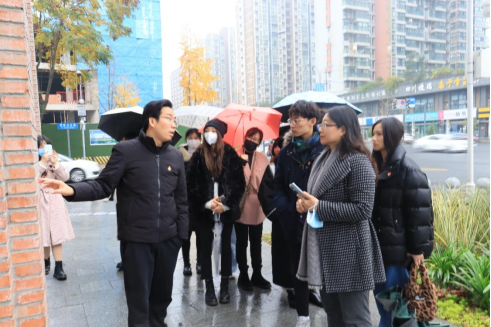 中共党员、主创设计师刘天庆带领全体师生参观项目,详细介绍了“学习强国”主题街区和“猛追湾城市更新示范区”项目的设计理念和设计创意,从设计到施工详细介绍项目经验,设计团队与师生就项目设计、工程总包、成都市城市更新现状与未来走向等方面进行了深度交流。