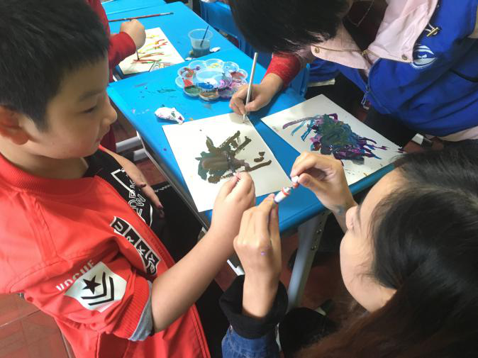 “小朋友们,你们平时喜欢画画吗?我们今天一起来画星星和月亮好不好呀!”志愿者亲切地对小朋友们说道。小朋友们边听边拿起手中的颜料和画笔在纸上涂鸦。在志愿者的帮助下,每位小朋友都创作出了富有特色的绘画和涂鸦作品。