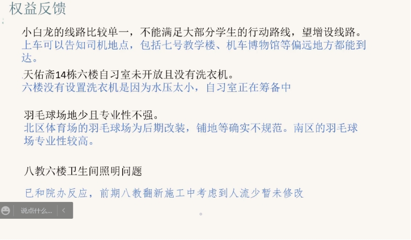 会议进行到的第三部分,主讲人高振帅发起了现场的权益交流和权益征集。在这一环节中,同学们积极反映了未提到和需要进一步改善的权益问题,包括八教停车场地、电梯故障和建院图书馆书籍管理等一些情况,对此,主讲人也进行详细的记录,并提到会尽快把提案的处理反馈给同学。